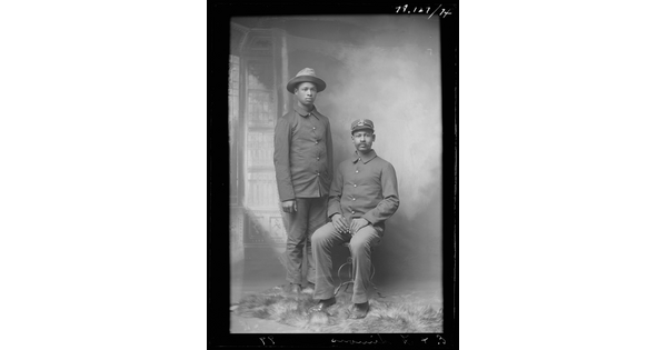 • A very old, worn black-and-white photograph in a gold frame of two men in formal attire posing for the camera.