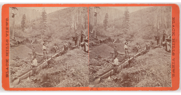 • No. 9 Mining Claims 14 and 15, below discovery, Deadwood Gulch, Miners running Sluice boxes.