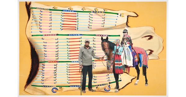 • A color photograph of a Native American youth in traditional dress on horseback, overlaid onto a decorative, cultural garment against a yellow background.