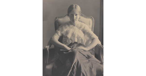 • A black-and-white portrait photograph of a White woman with curly hair pulled on top of her head, wearing a top with a ruffled collar.