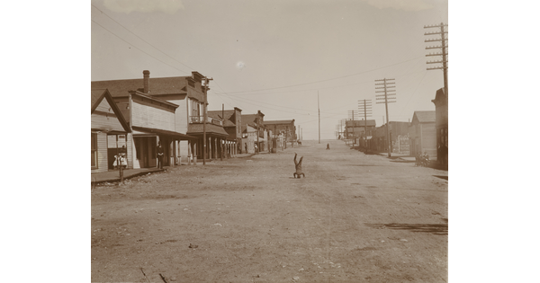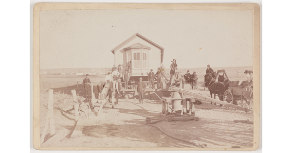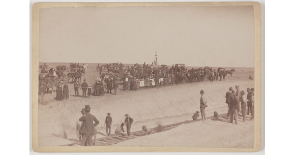 • [Crowd of spectators watching railroad construction]