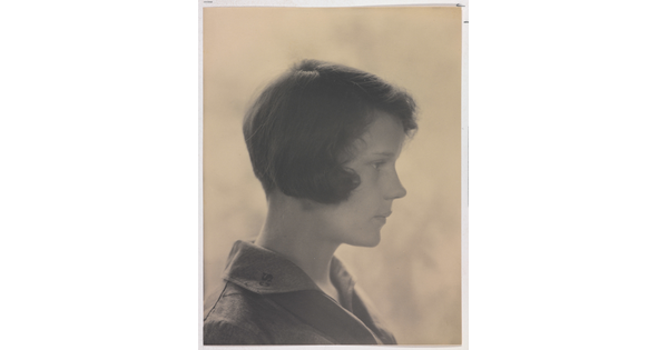 • A black-and-white portrait photograph of a White woman with curly hair pulled on top of her head, wearing a top with a ruffled collar.
