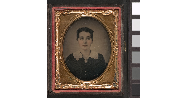 • [Young woman in dark dress with lace collar, wearing cameo pendant]