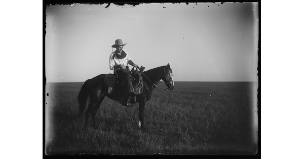• A black-and-white image of a White woman wearing a cowboy hat and plaid dress holding the reins of the horse standing next to her.