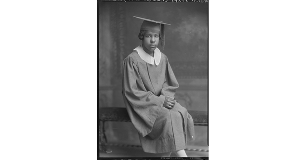 • A black-and-white image of a Black woman wearing a long-sleeved Victorian-style dress standing next to an easel holding an artwork.