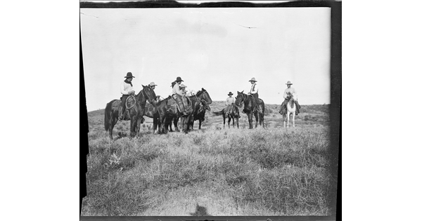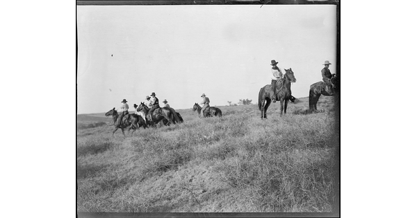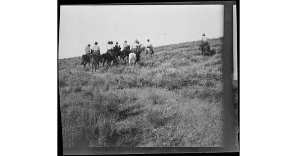 • A black-and-white image of a group of cowboys on horseback walking away from the viewer toward a field.