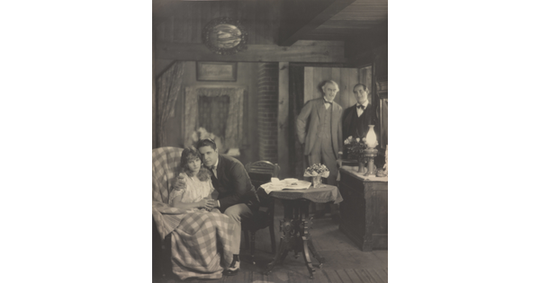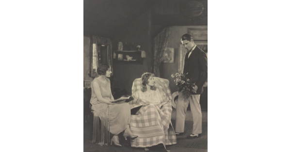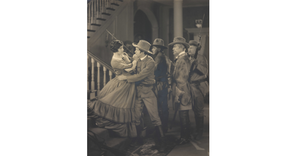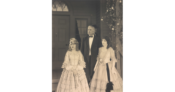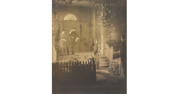 [Gertrude Short, Emmett King, and Florence Vidor standing on front porch, "Barbara Frietchie"]