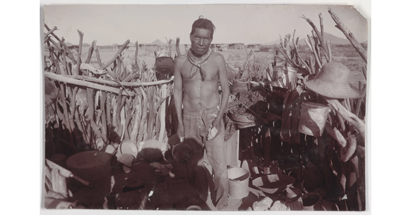 • [Portrait of Pima cook with pails and pans]