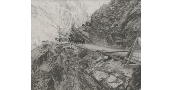 • [Stagecoach on mountain road]