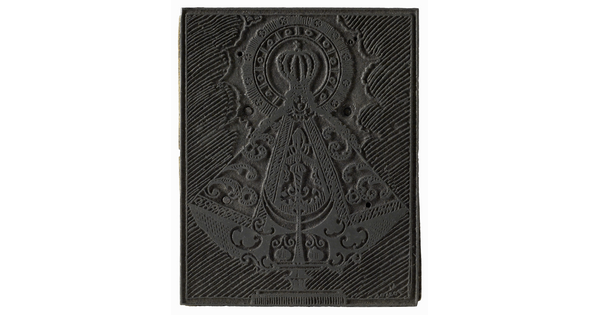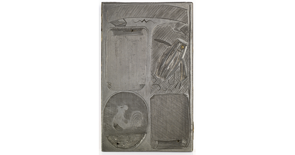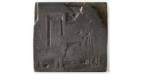 • A metal printing block with a portrait of the head and shoulders of a bearded man wearing armor.