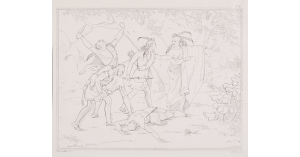 • An oil painting of an Indigenous man and woman on a cliff that overlooks a small town on a calm river.