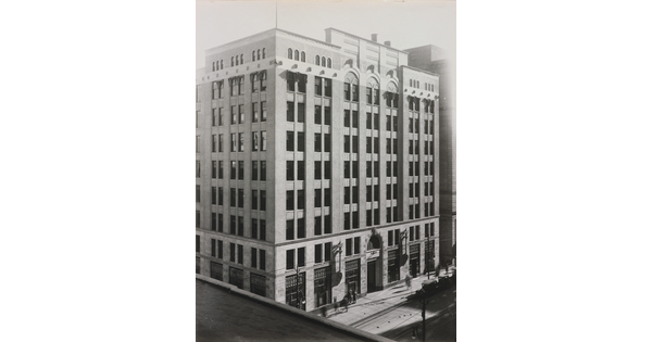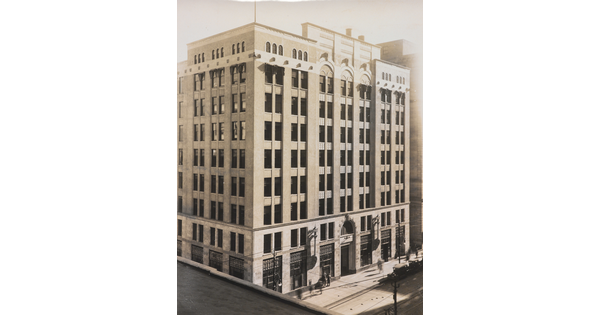 • A black-and-white photograph of the interior of an ornate office lobby with inlaid floors, columns, and chandeliers.