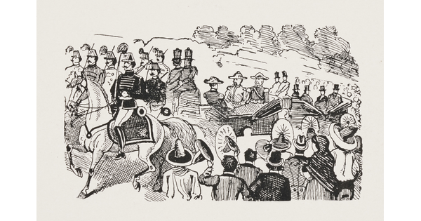 [Military and Civilian Dignitaries in Two Carriages with Military Escort with Crowd in Foreground]