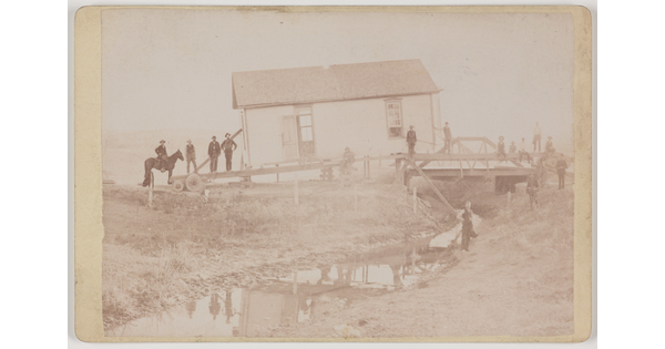 • [Men moving house over creek]