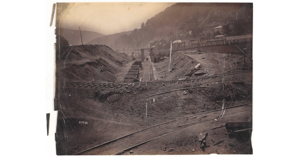 • [View of town with railroad construction]