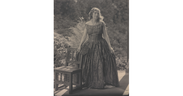 • [Woman in evening gown with fan]