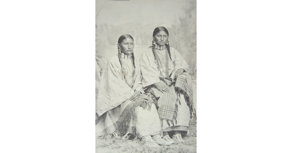 • A black-and-white photograph of a seated Native American woman in traditional clothing with her hair in braids and a blanket around her shoulders.