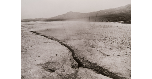 • A black-and-white photograph of industrial buildings with smoke stacks in a rocky valley.