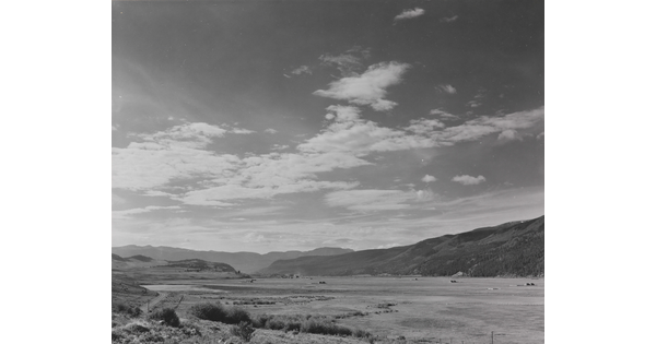 • A black-and-white photograph of a choppy river and then grassy plains and mountains beyond the shore.