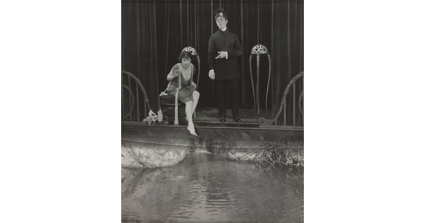 [Gloria Swanson sitting by grotto with Theodore Kosloff as Hindu hypnotist, "Affairs of Anatol"]