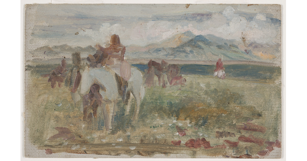 • An oil painting of cowboys tending to horses on green plains with various tents and structures in the background.