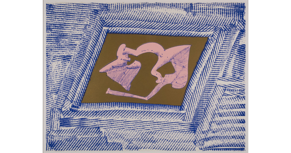 • An abstract color print of organic shapes in pink and light green and a bright green three-dimensional number 5 against a blue striped background.