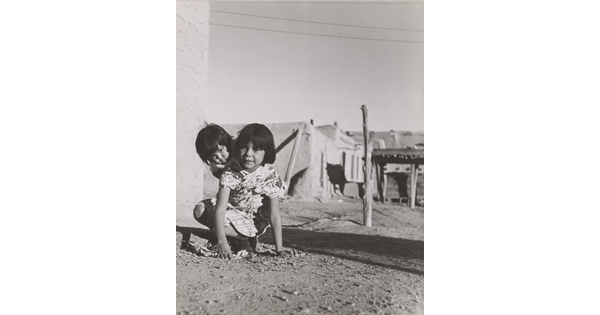 • [Santa Clara Pueblo girl kneeling with infant on back]