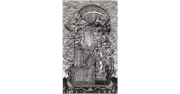 Collage of commercial packaging, corrugated cardboard, mixed media, and graphite