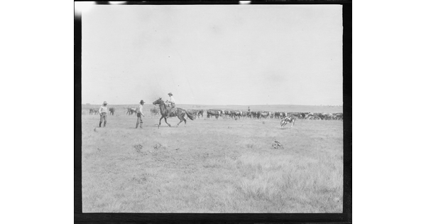 • A black-and-white image of a cowboy on horseback riding toward several other cowboys trying to corral a cow.