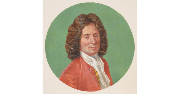 • A circular watercolor portrait of a brown-haired White man with blue eyes, wearing a blue vest over a white shirt, and ascot.