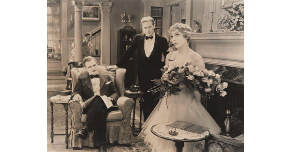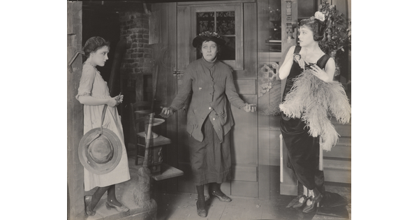 [Mary Pickford holding bouquet of roses with John St. Polis and Matt Moore, "Coquette"]