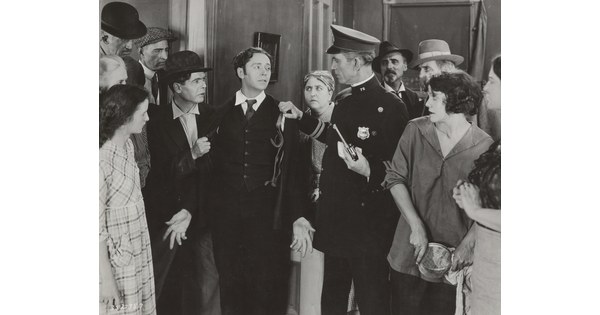 [Crowd surrounding Theodore Kosloff and policeman, "Forbidden Fruit"]