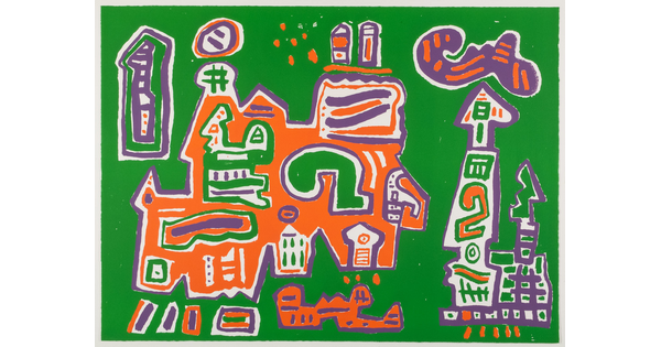 • A watercolor painting of an abstract landscape in earth-tone colors and white clouds against a background of gridded lines.