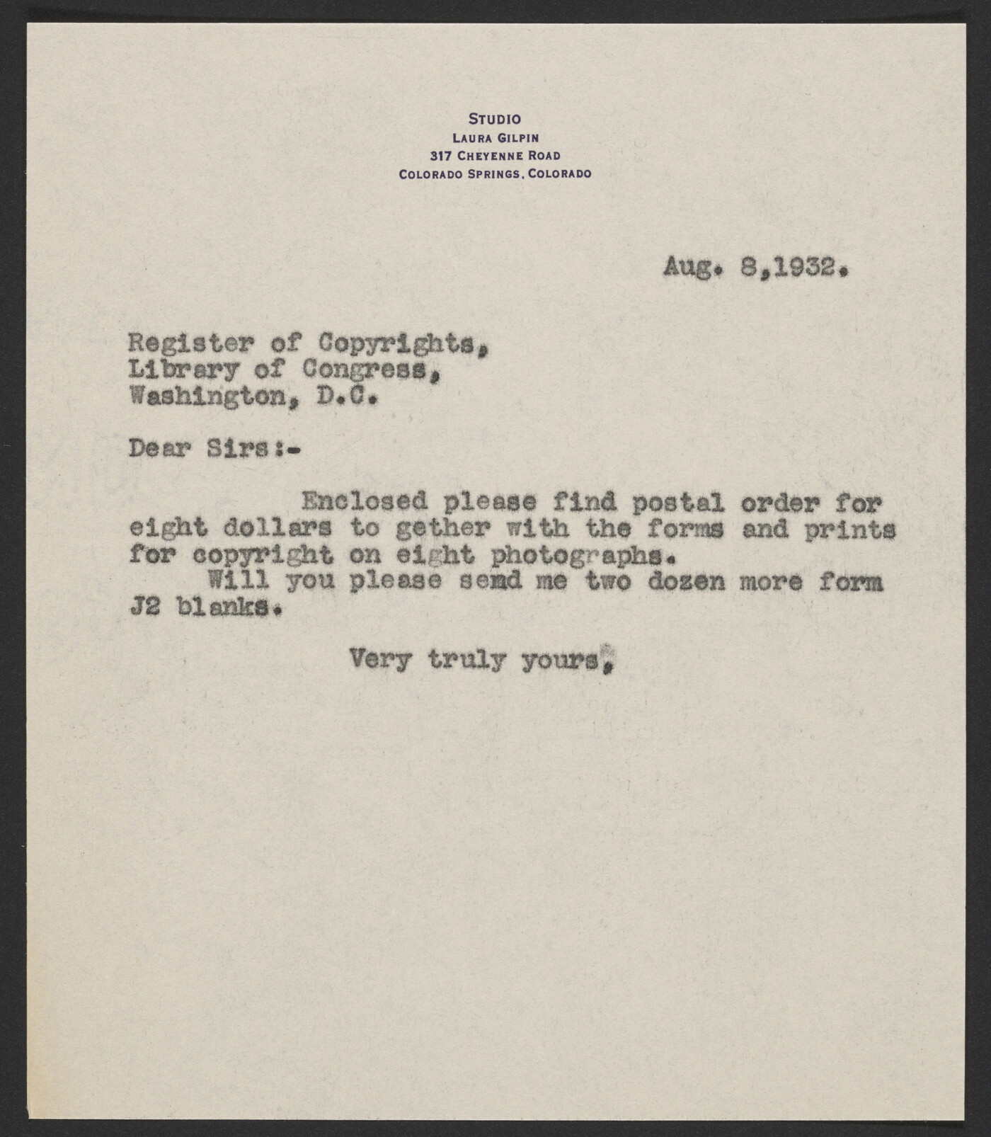 Anne Evans, The Central City Opera House Association, University of Denver, Denver, Colorado, to Laura Gilpin. n.d.