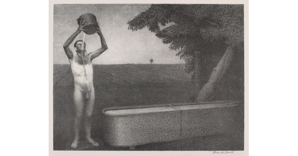 • A black-and-white print of a man by a water well next to a wooden barn in a snowy landscape.