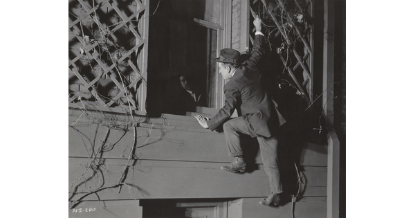 • [Clarence Burton climbing trellis in robbery scene, "Forbidden Fruit"]
