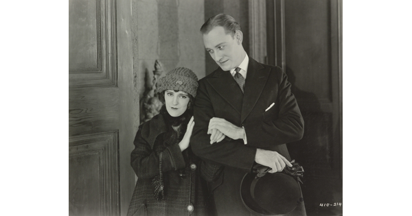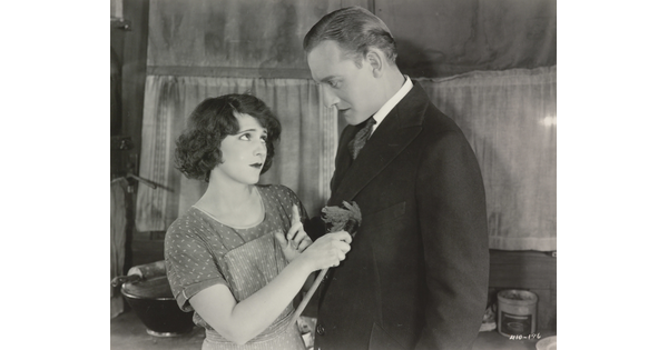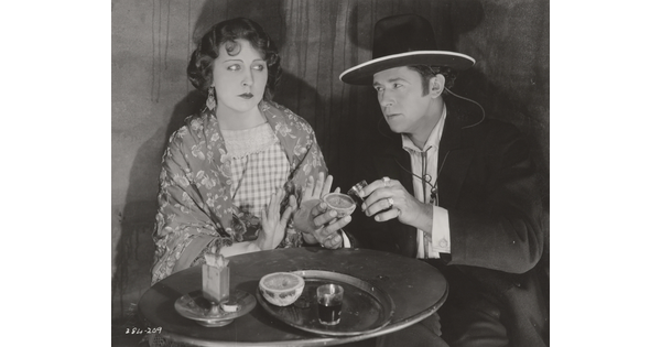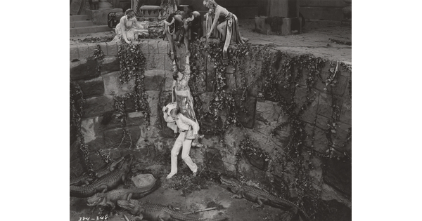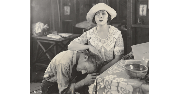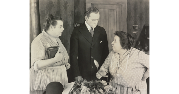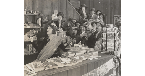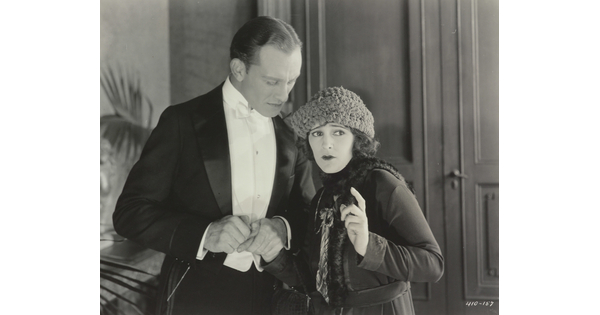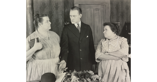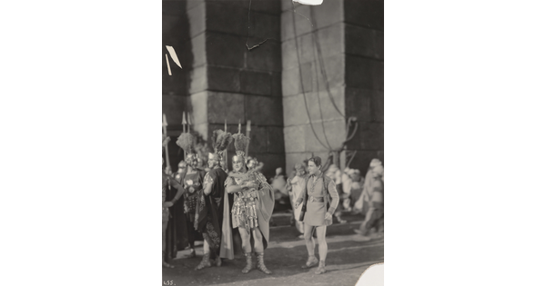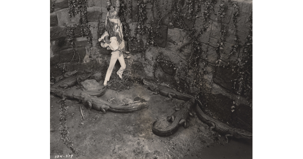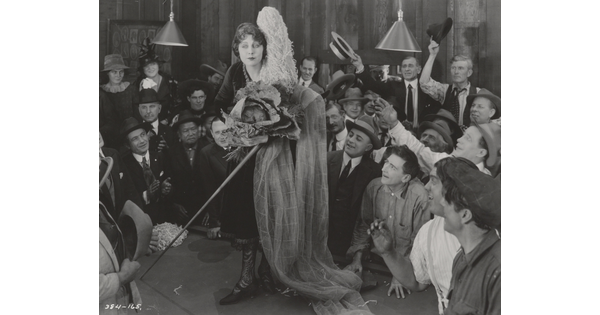 [Mildred Harris standing with Siamese men and peacock, holding paper, "Fool's Paradise"]