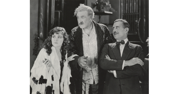 [Agnes Ayres and Theodore Roberts in pajamas, with Clarence Burton, "Forbidden Fruit"]