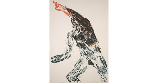 • An abstract color print of a nude male figure, drawn in purple, throwing a punch to the left.