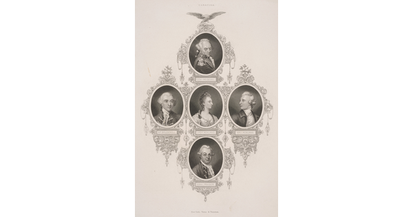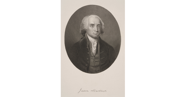• A black-and-white print of three men, one on horseback and two with pitchforks, next to a haystack and an old barn.