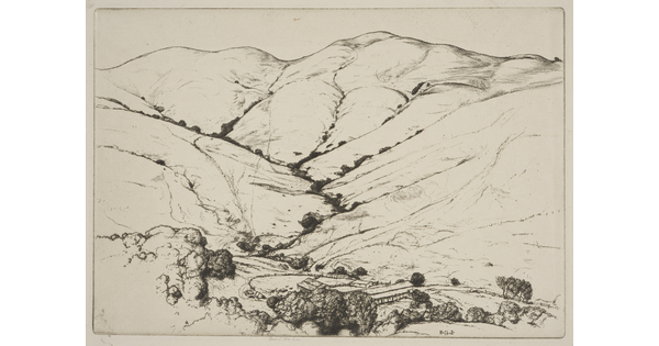 • An ink drawing of a Tudor-style home, partially covered in vines, and the rural landscape surrounding it.