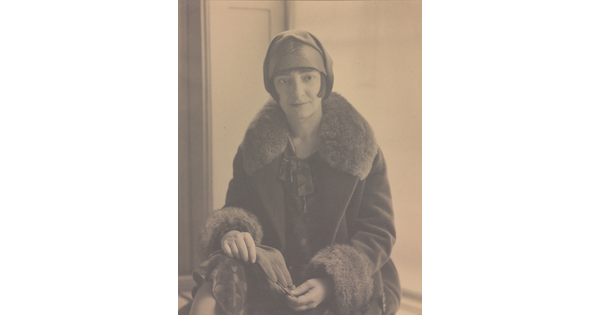 • A black-and-white print of a White women sitting in a cafe chair wearing a hat and fur coat while looking at the viewer.