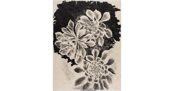 • A black-and-white print of an abstracted man with Asian features, a gray face, and wearing a delicate patterned necklace all on a dark background filled with flower-like designs.