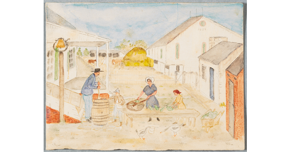 • A black-and-white photograph of a White woman and children wearing long dresses holding hands to form a circle in a grassy field.