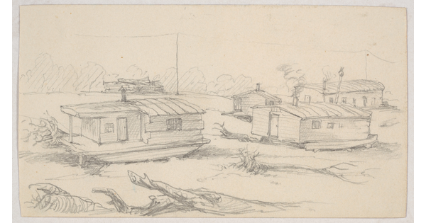 • [Riverboat houses on bank]